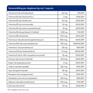 Vitaminen, mineralen, anti-klontermiddel (magnesium stearaat), vulmiddel (microcrystalline cellulose), hypromellose (capsulehuls), calciumcarbonaat (kleurstof).