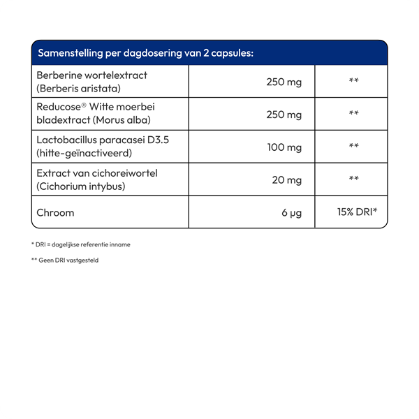 Indiase berberis wortel-extract (Berberis aristata DC.), witte moerbeiblad-extract (Morus alba L.), capsulewand: hydroxypropylmethylcellulose, maïszetmeel, maïsvezel, bacteriestam: Lactobacillus paracasei D3-5 (hitte-geïnactiveerd), cichoreiwortel-extract (Cichorium intybus L.), antiklontermiddel: magnesiumzouten van vetzuren, chroompicolinaat