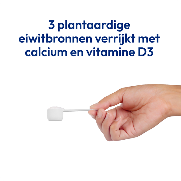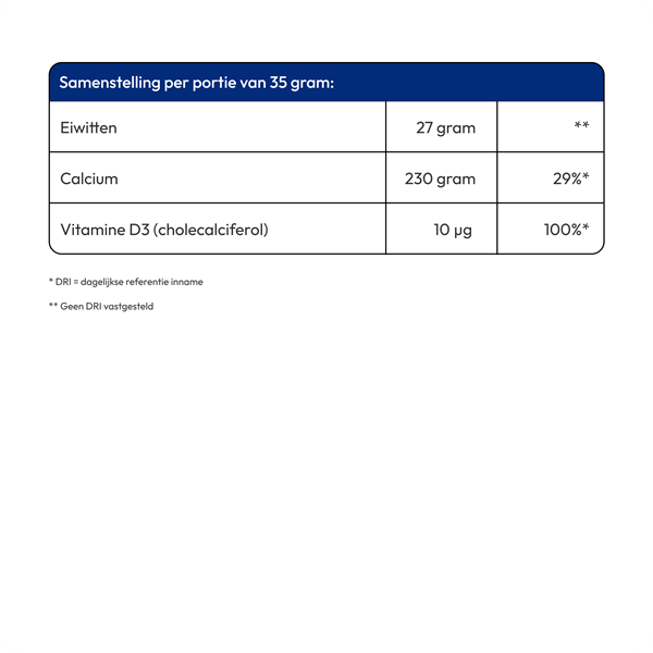Verrijkt met calcium en vitamine D3Het eiwitpoeder is verrijkt met calcium en vitamine D3. Calcium en vitamine D3 dragen bij aan het behoud van sterke botten en soepele spieren. Ook ondersteunt vitamine D3 de opname van calcium.