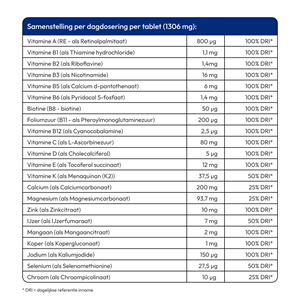 Calciumcarbonaat, magnesiumcarbonaat, vulstof (microkristallijne cellulose), ascorbinezuur (vitamine C), zinkcitraat, ijzerfumaraat, nicotinamide (vitamine B3), glansmiddel (hydroxypropylmethylcellulose), tocoferol succinaat (vitamine E), retinolpalmitaat (vitamine A), vulstof (siliciumdioxide), antiklontermiddel (magnesiumstearaat), mangaancitraat, kopergluconaat, calcium-d-pantothenaat (vitamine B5), seleniummethionine, pyridoxal-5-fosfaat (vitamine B6), bevochtigingsmiddel (glycerol), riboflavine (vitamine B2), thiamine hcl (vitamine B1), foliumzuur (vitamine B11), kaliumjodide, kleurstof (ijzeroxide), chroompicolinaat, biotine (vitamine B8), menaquinon (vitamine K2 uit soja), glansmiddel (bijenwas), cholecalciferol (vitamine D3), cyanocobalamine (vitamine B12).