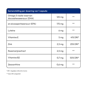 - DHA ondersteunt de conditie van het oog en helpt om scherp te blijven zien (vanaf 2 capsules per dag)