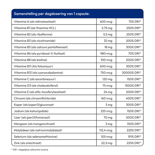 Vitaminen, mineralen, vulmiddel (microkristallijne cellulose), anti-klontermiddel (magnesium stearaat), hypromellose (capsulehuls), calciumcarbonaat (kleurstof).